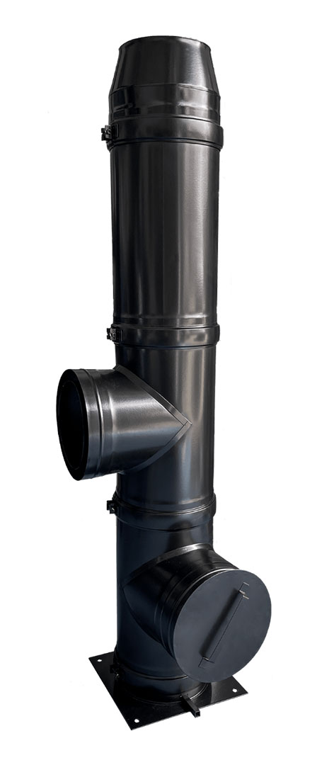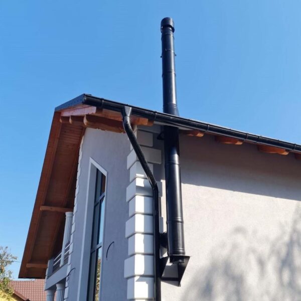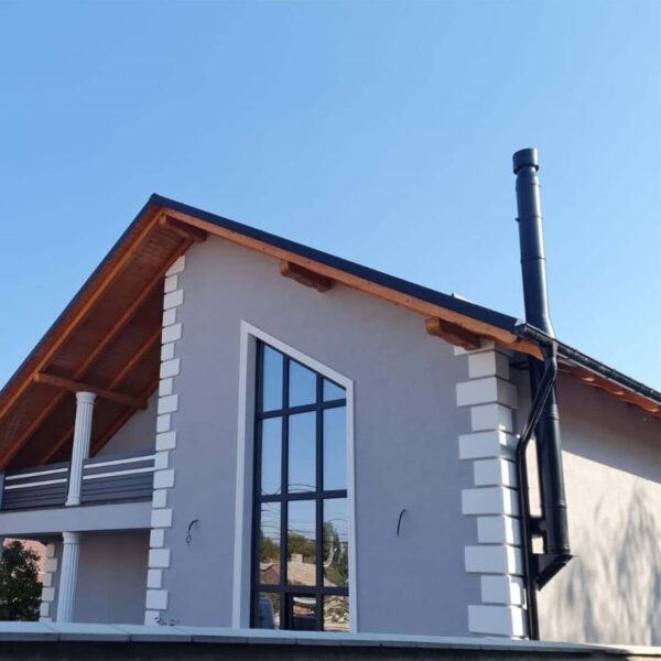 Sistemul de cos de fum din inox cu perete dublu KaminHorn NERO are invelisul exterior din inox vopsit in camp electrostatic, pentru a oferi un plus de eleganta, compatibilitate vizuala cu arhitectura cladirii si rezistenta marita in timp la zgarieruri.